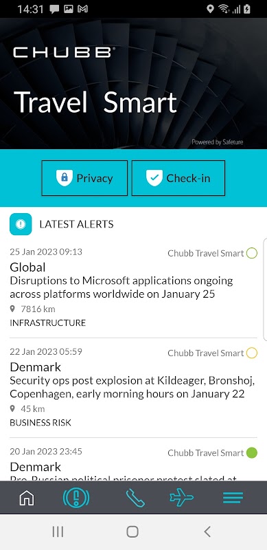 Chubb Travel Smart'ın en son sürümü, bulunduğunuz yere veya planlanan varış noktanıza göre potansiyel tehditlerin daha hızlı tanımlanmasını ve iletişimini sağlamak için son teknoloji bilgi madenciliği teknolojisini kullanır. Haber medyası, devlet kurumları, güvenlik ve sağlık bilgi veri tabanları ve sosyal medya dahil olmak üzere dünya çapında binlerce farklı kaynaktan gelen bilgileri toplar ve filtreler. Tüm bilgiler, doğru ve zamanında uyarıların size ulaştırılmasını sağlamak için bir uzman ekibi tarafından 7/24 gözden geçirilir ve iyileştirilir, böylece güvende kalmanıza ve sorunlardan kaçınmanıza yardımcı olur.