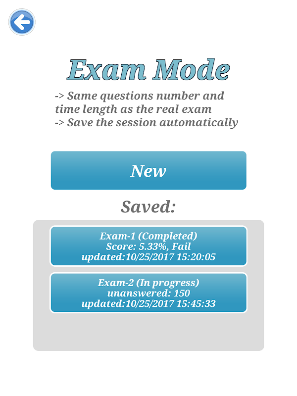 - The app will save your practice/exam automatically, so you can continue your unfinished exam anytime