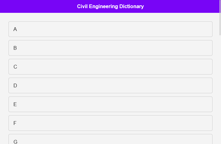 İnşaat mühendisliği alanındaki öğrenciler, profesyoneller ve meraklılar için tasarlanmış eksiksiz bir uygulama olan inşaat mühendisliği sözlüğüne hoş geldiniz. İster üst notları hedefleyen bir öğrenci, ister hızlı referans arayan bir profesyonel, ister sadece bu alanla ilgilenen biri olun, bu kapsamlı sözlük inşaat mühendisliği terminolojisini anlamak için başvuracağınız kaynaktır.