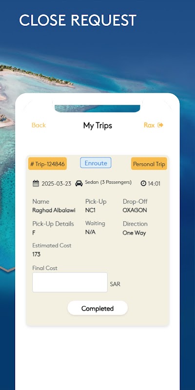 Bu uygulama, Neom bölgesinde faaliyet gösteren taksi şoförleri için özel olarak geliştirildi ve yolculukları yönetmek ve ulaşım deneyimini geliştirmek için akıcı bir yol sunuyor. Sürücüler, yolcu bilgileri, alınış saati ve varış noktası dahil olmak üzere kendilerine atanan yolculukların tüm ayrıntılarına kolayca erişebilir. Uygulama, yolcularla gerçek zamanlı konum paylaşımına olanak tanıyarak iletişimi daha sorunsuz ve şeffaf hale getiriyor. Ayrıca yolculuk sürelerinin doğru şekilde izlenmesini sağlayarak daha iyi zaman ve kaynak yönetimine yardımcı olur. Ayrıca, adil tahsis ve organize operasyonların sağlanması için gezi talepleri yönetim tarafından uygulama aracılığıyla dağıtılmaktadır. Verimlilik ve kullanım kolaylığı göz önünde bulundurularak tasarlanan bu uygulama, hizmet sağlayıcılar ile yolcular arasında doğrudan ve etkili bir bağlantı oluşturarak daha güvenilir ve kusursuz bir ulaşıma katkıda bulunuyor.