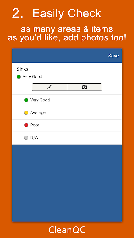 • Kullanımı kolay! Kalite kontrol incelemesindeki derecelendirmeler önceden ayarlanmıştır, dolayısıyla bunları yalnızca temizlik sorunlarıyla karşılaştığınız alanlar için değiştirmeniz gerekecektir.
