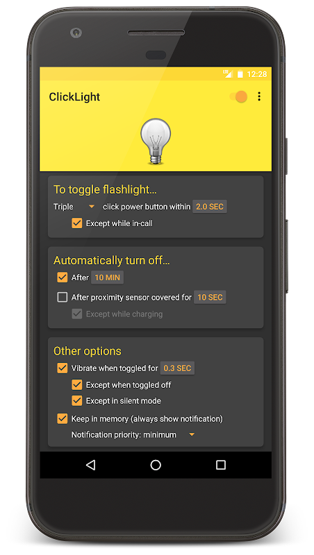 ClickLight, cihazınızın parlak LED el fenerini açmanın çok hızlı bir yolunu sunar. Telefonun kilidini açmaya, bir uygulamayı açmaya veya bir widget bulmaya gerek yok. Işığı açmak veya kapatmak için istediğiniz zaman güç düğmesini üç kez tıklamanız yeterlidir. Lütfen güç düğmesinin ekranı gerçekten açıp kapattığından emin olun. El feneri ayrıca bir widget'tan, QuickSettings kutucuğundan, bildirimden veya uygulamanın içinden değiştirilebilir!