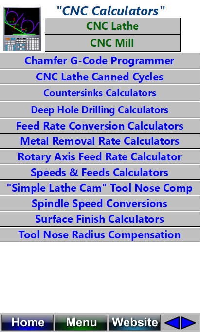 Web Machinist App has many cnc programming calculators for CNC Machinists, Programmers and QC Inspectors. Bolt Circle Calculator, Wheel Bolt Pattern Calculators, Including Calculators for Angles, G code lists, M code lists, CNC Applications, Metal Weight Calculators for both Metric and Imperial calculations, CNC Lathe Fanuc Canned Cycles including G76 Thread Cycle Calculators, Simple Lathe Cam CNC Lathe Tool Nose Compensation G-Code Calculators, metal weight calculator, Chamfer G-Code Calculators, Metric Conversions, Countersink Depth Calculators, Center Drill Depth Calculators, General Conversions, CNC Drilling, CNC Mill & Lathe Deep Hole Drilling calculators, Dovetail Measuring Calculators, Blueprint Symbols, G Codes, M Codes, Machining Formulas and calculators, Spindle speed and feed rate formulas and calculators, circle solving formulas, Hole Patterns, Hole Array Patters including full circle and partial circle patterns, 3 Wire Threads Pitch Diameter Measuring Calculators for Unified Threads, Metric Threads, Acme Threads and Metric Trapezoidal Threads, CNC Lathe Tool Nose Radius compensation calculators, QC Inspection, Manual Machining, Metal Removal Rates, CNC Milling, Reference, Rotary Axis, Speeds & Feeds, Imperial and Module Spur Gear Dimensions Calculators, CNC Tapping, CNC Threading, Manual Lathe Calculators, Unified Threads, Metric Threads, Acme Threads, Metric Trapezoidal Threads, Spur Gears, Module Spur Gears, Imperial Spur Gears, Area Calculators, Triangles, Circle Calculators, Mill Machine Tooling, Collets dimensions, Keyseat Cutters Calculators, Trigonometry Calculators, Hole Pattern Calculators, Wheel Bolt Pattern Calculators, Manual Mill Calculators, Tooling & Hardware, Sine Bar and Compound Sine Plate calculators, Trigonometry & Geometry, circle calculator, Shop Math Calculators, Lathe Spindle Speed Calculators, CNC Tapping Speeds Calculators, Surface Roughness Calculators, Drilling Speeds Calculators, Tapping Speeds Calculators, CNC Turning and Miscellaneous Calculators. This is a Must Have Program for Machinists, CNC Machinists, Machine Shops, QC Inspectors, CNC Set-up Operators, CNC Programmers.