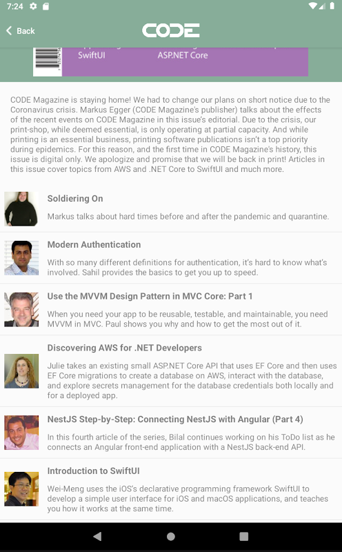 Bu uygulama CODE Magazine abonelerinin Android cihazlarında sahip oldukları derginin tüm sayılarını okumasına izin verir.