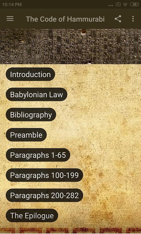 Bu uygulama L. W. King tarafından tercüme Hammurabi Kodunu içerir.