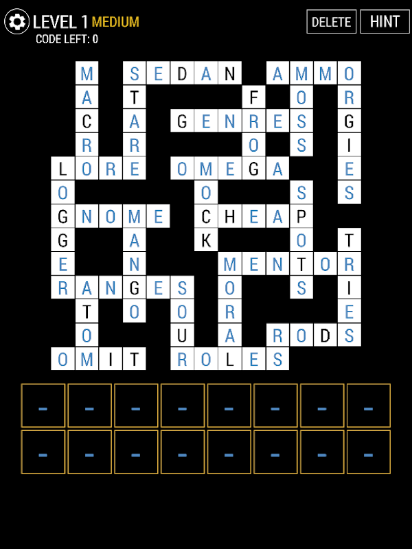 Words in board are in vertical lines or horizontal lines but many letters of them are hidden and coded by numbers. The Codes for letters change from level to level and the same letter has the same code.