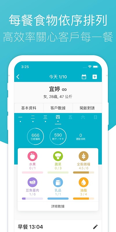 * 瀏覽客戶資料及每天上傳的飲食,並快速計算、回覆