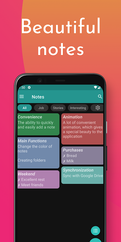 Bu bulut senkronizasyonu ve çeşitli yazı tipleri ile güzel ve kullanışlı bir not defteri. Onun sayesinde, önemli notlarınızı hızlıca hazırlayabilir ve bunları klasörler halinde sıralayabilirsiniz. Ve hiç kimse notlarınızı okuyamıyor, bir şifre ve parmak izi ile engelleyin!
