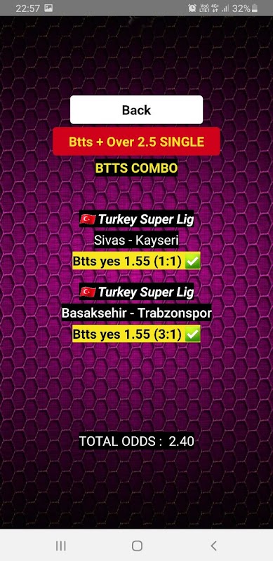 "Kombo Bahis Tahminleri 2+" ile tanışın; 2+ oranlı kombo bahisler için mükemmel uygulama! Uygulamamızla, ustalıkla hazırlanmış üç karma tahminin yanı sıra 1, 4 veya daha yüksek oranlı üç yüksek değerli maksimum bahis tahminine erişebileceksiniz.