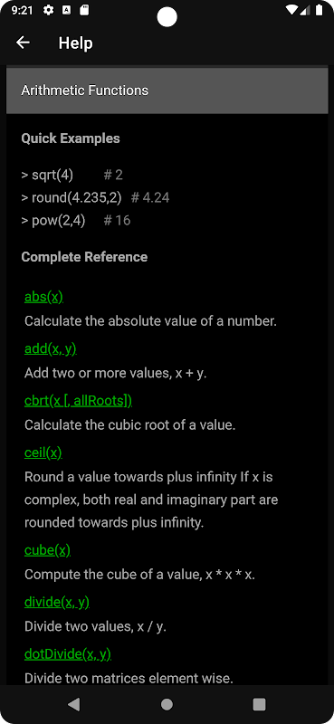 Bu uygulama aynı zamanda birçok örnek içeren kapsamlı bir dahili yardım sistemi ile birlikte gelir. CLCalculator, math.js tarafından desteklenmektedir (https://mathjs.org/)