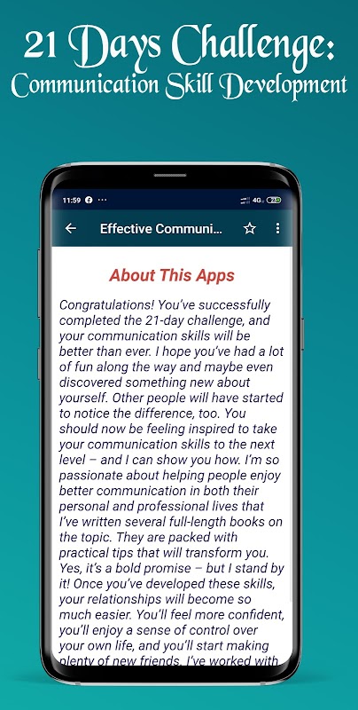 Develop your communication skill in Just 21 days. This english communication skills app provide best guideline to develop your communication skill. This app made from the best communication skills free books so that our users can improve their communication skills. Who uses this communication skill improvement app, he/she must acquire the best knowledge about communication with others.