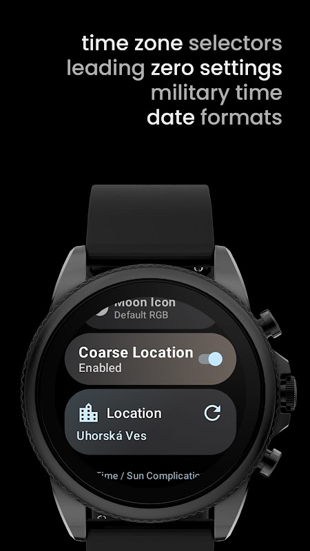 Ek olarak, konum ayarlandığında ay evresi komplikasyonu, gözlemcinin konumundan gerçek bir görsel sunmak için ay simgesinin açısını ayarlayacaktır (ayrıntılı simge)