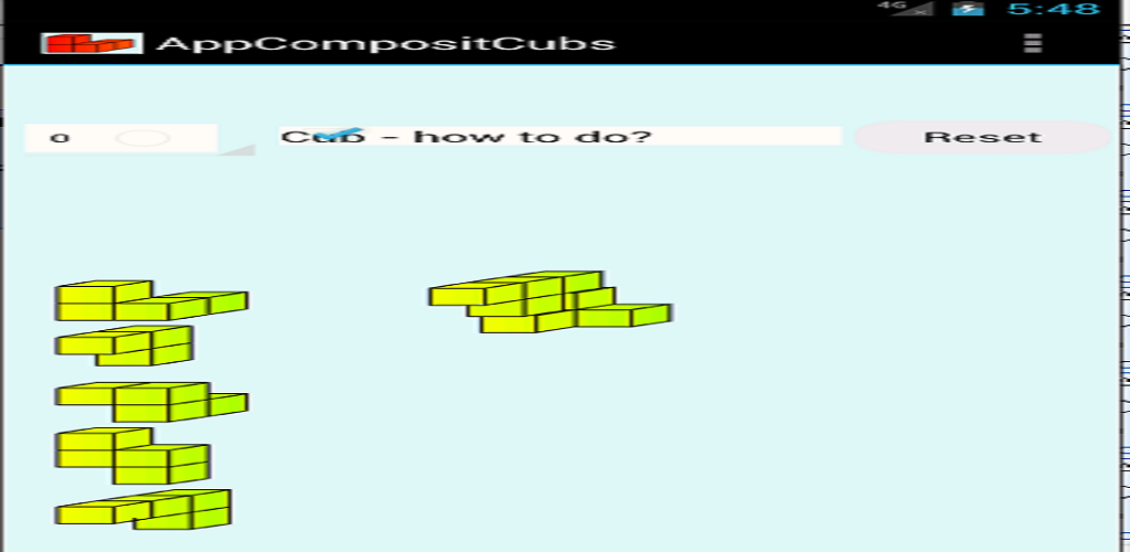 Uygulama, 27 küpün yedi şekilde birleştirilmesiyle oluşan en küçük hacme sahip bir bileşik şekil çizme oyunudur. Ayrıca, en küçük çevreleyen yüzeye sahip bir şekil çizmek için de kullanılır. Dikdörtgen prizma oluşturulabilir. Uygulama, yedi şekli 6 varyantta gösterir ve ilk iki problem için bir öğretmene sahiptir.
