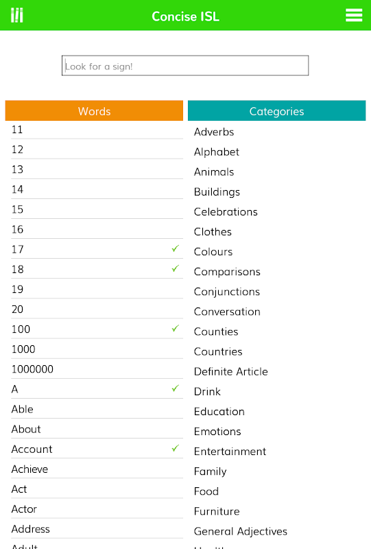 Basit ve etkili bir arama arayüzü, kaydırma hareketleri, kayan menüler ve diğer sezgisel etkileşim mekanizmaları kullanılarak, Concise ISL içinde belirli kelimeler ve kategoriler kolayca bulunabilir.