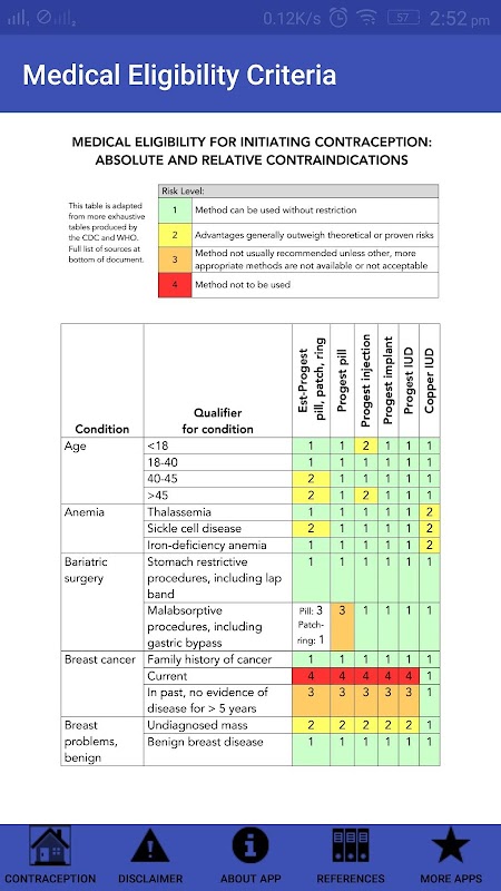 ana ekran ekran görüntüsü görüldüğü gibi, bu app kaynaklar şunlardır: Tıbbi Uygunluk Kriterleri (kontrendikasyonlar) başvuru tablosu, Hızlı Başlangıç Algoritmalar, Metot Etkinliğinin tablo, pazar ve diğer sivil hap hormon formülasyonların tüm OCP Formülasyonlarının tablo, rehberlik üzerinde seç & OCP dozları ayarlama nasıl, nasıl, rehberlik, doğurganlık bilinci yöntemlerine ilişkin adımlar karşılaştırmalı tablo odaklı Acil Kontrasepsiyon yöntemleri için Adımlar karşılaştırmalı tablo odaklı TÜM doğum kontrol yöntemleri için kriterleri (güvenlik, tolere edilebilirlik, etkinlik, fiyat, rejim basitliği) ADIMLAR doğum vermeden önce yöntemleri ve gerekli inceleme ve testler (ön koşullar) bir tablo geçin.