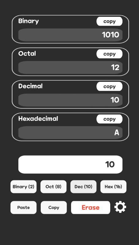 Her ondalık sayının (ikili, sekizli, ondalık, onaltılık) sonuç değerini kopyalamak için bir 'Kopyala' düğmesi vardır.