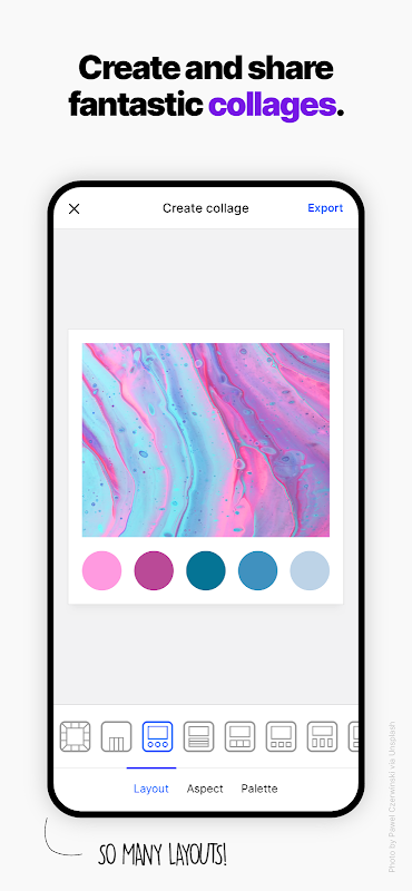 • Birkaç düzen arasından seçim yapın ve fotoğraflar ve paletlerle güzel kolajlar oluşturun