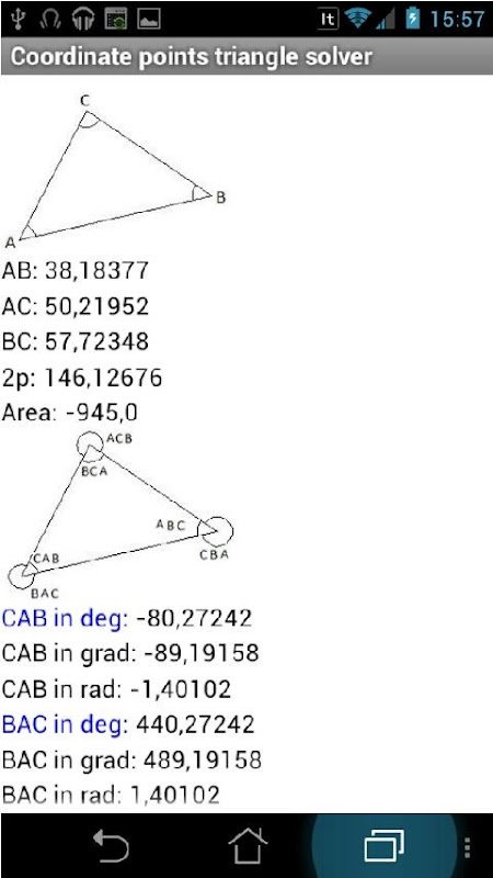 Coordinate points triangle solver is an user-friendly app that allows you to calculate a lot of values starting from just 2 or 3 couple of coordinates that the user inputs ( the app calaculates 9 values for 2 couple of coordinates and 74 values for 3 couple of coordinates ).