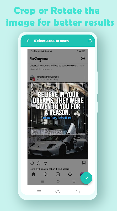 3. Görüntüyü kırparak / döndürerek taranacak görüntü alanını seçin ve görüntüyü OCR (Optik Karakter Tanıma) ile taramaya başlamak için uygulama ekranının altındaki onay işareti düğmesine basın.
