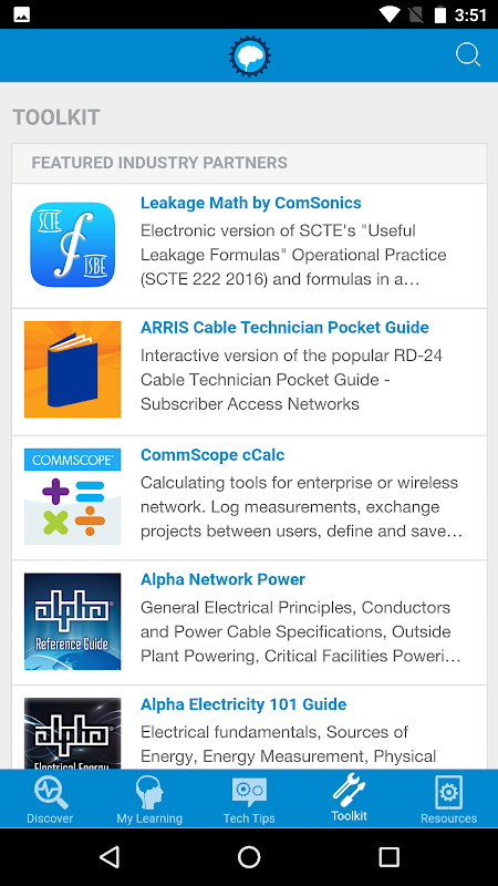 As a benefit of your annual membership, SCTE members can access technical resources, learning material, primer videos, Live Learning Webinars, standards, and more using CORTEX Mobile. Search technical product material from cable industry partners, read industry news articles, and access online course material while you're on the go. Use the Toolkit to get the very best calculators and tools right on your smartphone.