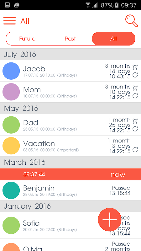 İster gerçekleşti ve bu gelecekte olacak tüm yaşam olayları hatırlamak istiyorum? ne kadar süre mezuniyet geçti ya da ne kadar öğrenmek bırakılır öğrenin? Kaç saniye, dakika ve saat duman ya da bir diyet değil mi? öğrenin zaman olaylarından önce birkaç gün bildirimleri ve saat akraba ve arkadaş doğum günü? Ne kadar zaman uzun zamandır beklenen tatil önce bırakılır? (Gün, ay ve yıl olarak) Çocuğunuzun kesin yaşı nedir? Ne zamandır yeni yıl ya da başka tatili öncesinde? Ne zaman bir bildirim ile önemli belgeleri (ehliyet, pasaport, sigorta, vs.) geçerlilik? önemli toplantı hakkında unutmayın? (Günlük ve saatlik hatırlatma ile birlikte) ilaç ve hap kullanmayı ihmal etmeyin? Bir doktor ya da diğer uzman görmek için unutma? faturalar, telefon, internet, sigorta aylık ödeme unutmayın? Banka kartı bitiminden hakkında hatırlatın? Bu uygulama hayatında vazgeçilmez bir araç olacaktır.