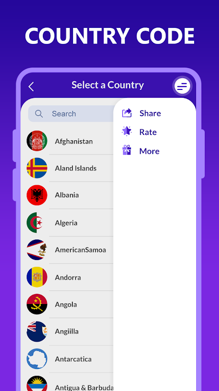This application provides you other information like area code, Country Code, ISO country capital, country flag, etc.