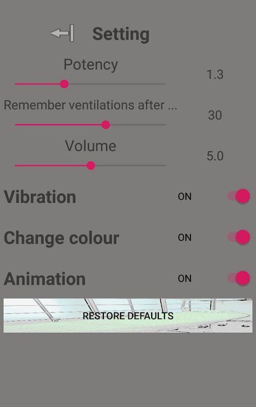 In the settings you can set, the value of the force to be exercised, the value of the number of massages after which you must remember to carry out ventilation (by default 30), if you activate the vibration, the volume of the sound, if you activate the color change, whether to activate the animation.