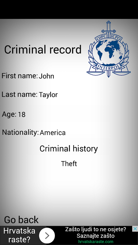 After that his fake criminal record will appear with his first name, last name, age and nationality on it.