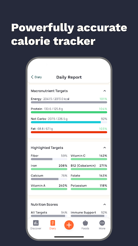 - Kapsamlı beslenme takibi - kalorileri, makro besinleri ve 84 mikro besini kaydeder