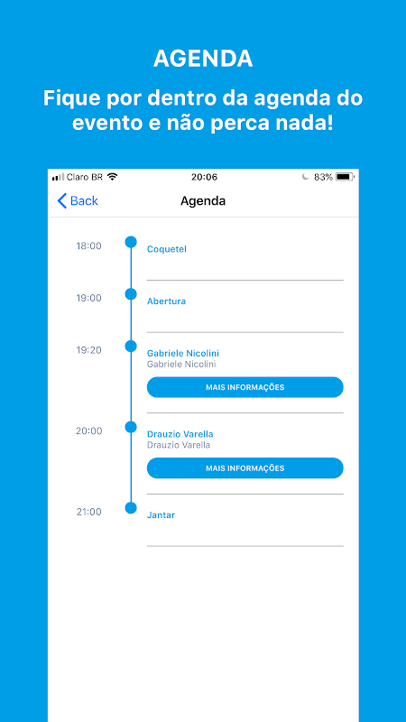 Nosso aplicativo possui todas as informações necessárias para que você acompanhe e não perca nenhuma informação sobre o evento. Algumas informações essenciais como agenda do evento, logística (vôos, hospedagem e transfer), galeria de imagens e vídeos em destaque podem ser utilizadas para melhorar sua experiência durante o evento.