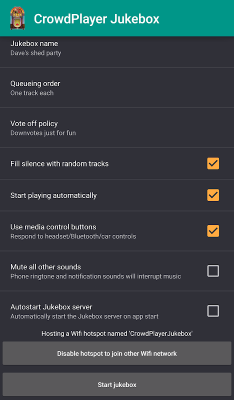 Choose the device with the most music to be the jukebox, connect it to the speakers using the headphone socket or Bluetooth, start the CrowdPlayer app and press 'Create Jukebox'. If there's a free Wifi network available join it, otherwise press 'Create a Wifi hotspot'. Press 'Start Jukebox'.