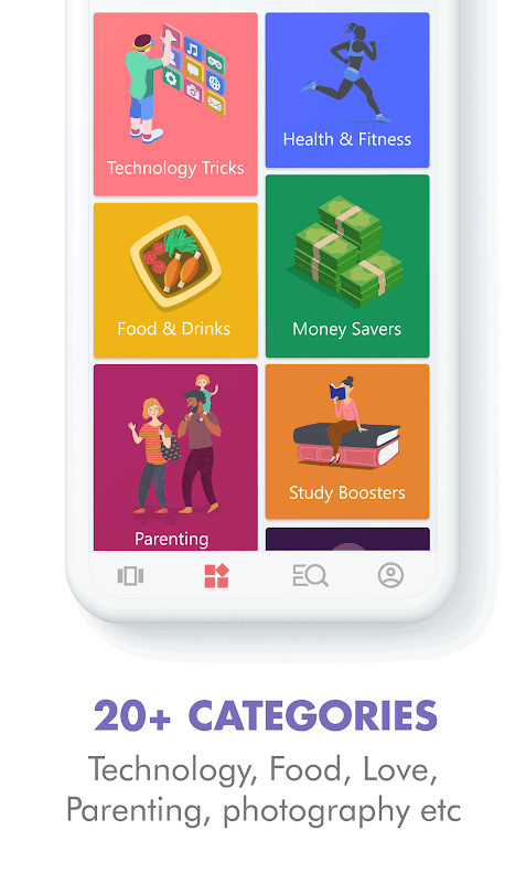 Teknoloji hack, yiyecek ve içecek ipuçları, yoga ipuçları, sağlık ve fitness çözümleri, mizah hack, ebeveynlik becerileri, günlük yaşam çözümleri, DIY el sanatları, para tasarrufu fikirleri, hayat ipuçları, ilişki ipuçları gibi çeşitli hayat kurtarıcılar ve içerik kategorileri tek bir app kombine, parti fikirleri, moda ipuçları, makyaj hacks, fotoğraf hileler, hayatta kalma hacks, çalışma güçlendiriciler, zeki hacks, seyahat rehberleri, merak busters, gerçekler ve beslemeleri, girişimcilik hacks, başlangıç hack, ücretsiz oyunlar.