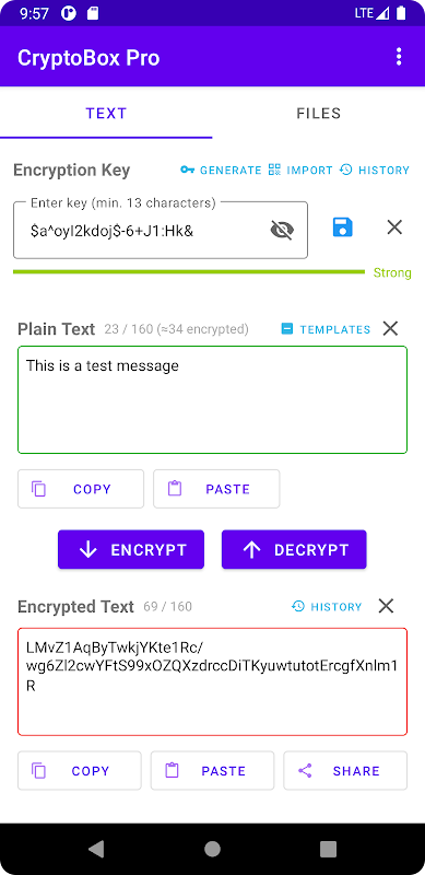 Hassas mesajlarınızı ve dosyalarınızı askeri düzeyde şifrelemeyle koruyun. CryptoBox Pro, endüstri standardı algoritmaları (AES-GCM ve ChaCha20-Poly1305) kullanarak metin ve dosya şifrelemesi için kullanıcı dostu bir arayüz sunar.