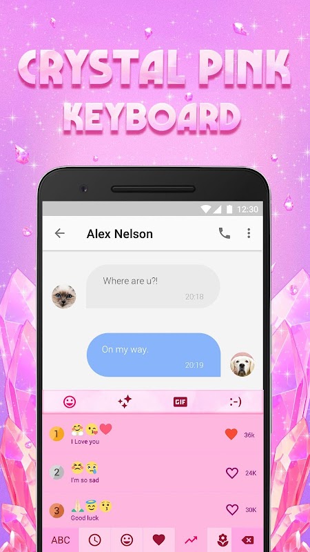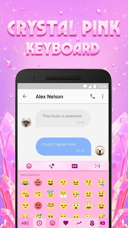 This Crystal Pink Emoji Keyboard Theme uses Facemoji Keyboard Facemoji Keyboard + GIFS. Please click the link to have it installed first.