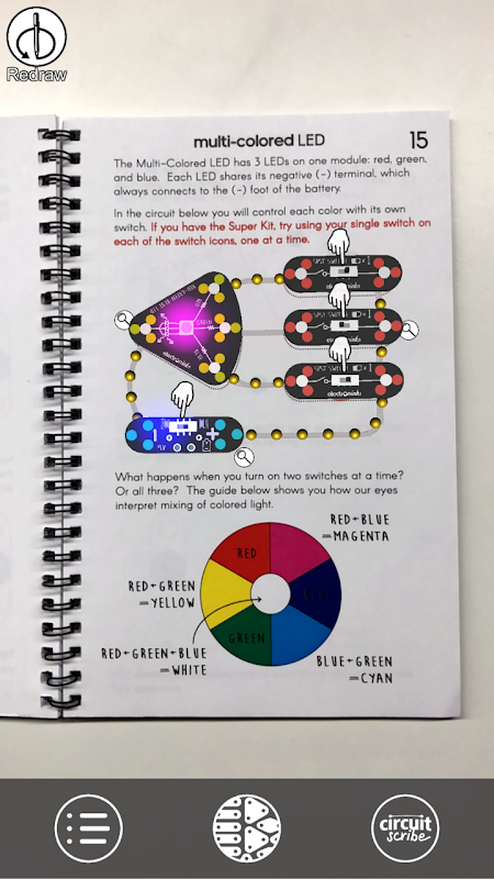 Uygulamayı kullanmak kolaydır - cihazınızı Circuit Scribe Inventor’ın Not Defteri’ndeki (PDF olarak indirilebilir) herhangi bir sayfaya bir devre şeması içeren yerleştirin ve hayata geçirin. CS uygulaması, her türlü elektronik modülün (LED'ler, sesli alarmlar, motorlar, transistörler, potansiyometreler, 555 zamanlayıcı içeren flaşörler, bir ışık sensörü ve anahtarlar) bağlanması hakkında bilgi gösterir.