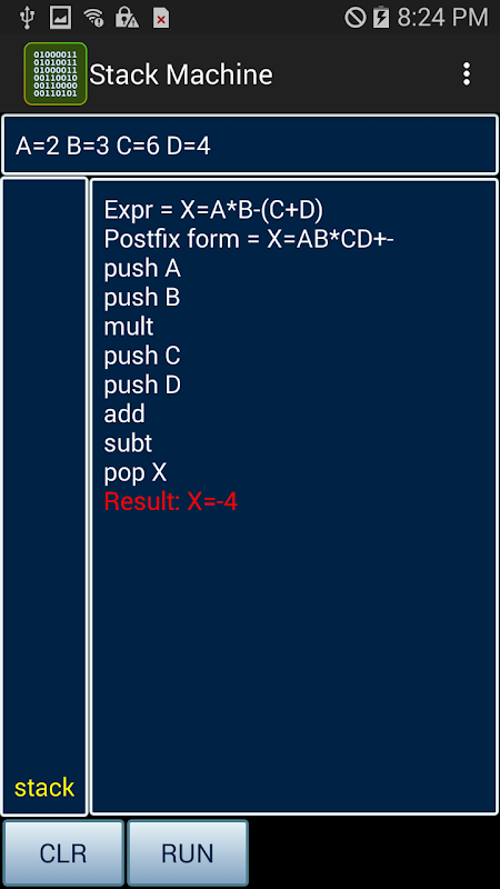 This package provides the UI to support the implementation of a simple stack machine, which accepts algebraic expressions from the user, convert such expressions into the postfix form, and evaluate them. As a demonstration, the machine currently accepts the expression X=A*B-(C+D). To see the stack machine in operation, see the video at https://youtu.be/73EwTyVl9zQ