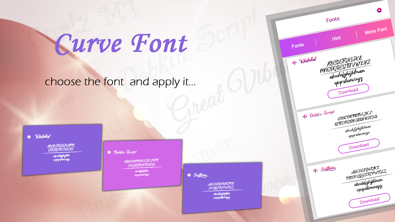 Use our smart Curve Free Font Style application which is allows users to get one or more Font Style in your mobile for free. Application which allows users to see instant preview about fonts and then apply on device. Quick settings to change your font directly fast within some seconds. Get Curve Fonts with Large collection and best way to change the stylish look to Android Phone with attractive Fonts.