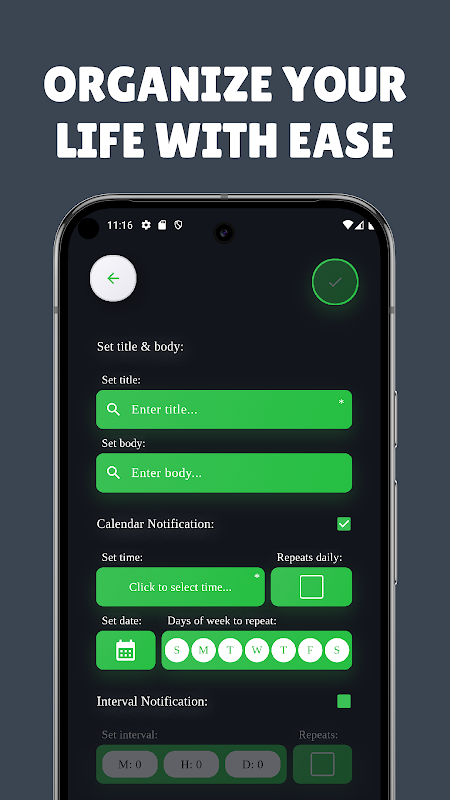 Hayatınızı kolaylaştırmak ve daha düzenli hale getirmek için tasarlanmış en iyi bildirim oluşturucu uygulamasıyla tanışın! Uygulamamız kullanıcı dostu, hızlı ve şık olup herkesin kullanımına açıktır. Uygulamamızla önemli görevleri veya olayları unutmayı reddederek yaşam kalitenizi artırabilirsiniz. Bir bildirim oluşturmak ve hayatınızı daha iyi hale getirmek yalnızca birkaç saniye sürer. Bir hatırlatma uygulamasına, görev yöneticisine veya kişisel asistana ihtiyacınız olsun, bildirim oluşturma uygulamamız sizin için mükemmel çözümdür. Erteleme ve dağınıklığa elveda, zaman tasarrufuna, verimliliğe ve kullanıcı memnuniyetine merhaba deyin. Uygulamamızı bugün indirin ve hızlı ve kolay organizasyon, zaman yönetimi ve hafıza yardımının avantajlarını deneyimleyin.