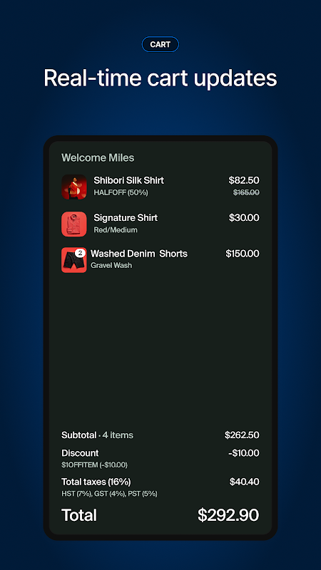 Müşteri Görünümü, herhangi bir Android cihazını özel bir müşteri ekranına dönüştüren, Shopify POS için mükemmel bir müşteriye yönelik yardımcı uygulamadır. Müşteriler sepetlerini görüntüleyebilir, bahşiş verebilir, ödeme yapabilir ve kendi makbuz seçeneklerini seçebilir.