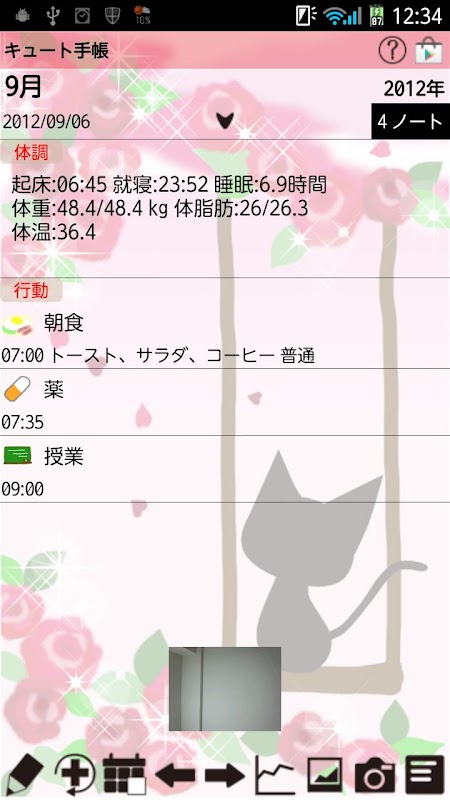 Sen / Uyandırma zamanı / Yatak zaman / Sleeping saat / Koşullar (yüz simgeleri), Ağırlık / Yağ oranı / Sıcaklık (bazal vücut ısısı) / Kan basıncı / Pulse ve Memo kaydedebilirsiniz.