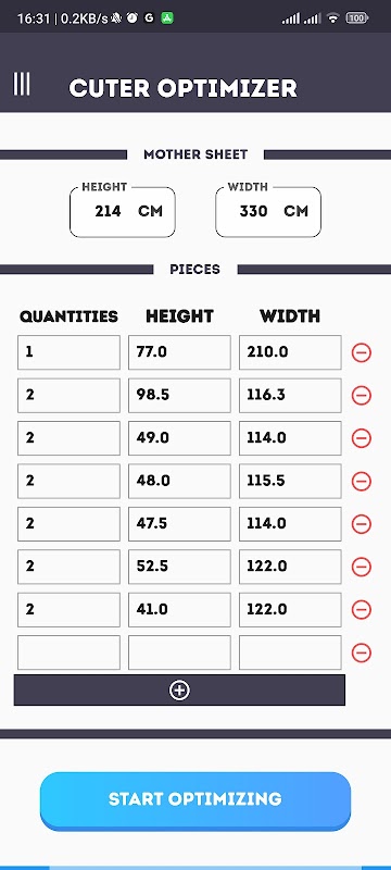 ✂️ Hassas Kesimler: Kesim boyutlarınızı girin ve CUTER OPTIMIZER'ın en uygun kesim planını oluşturmasına izin verin.