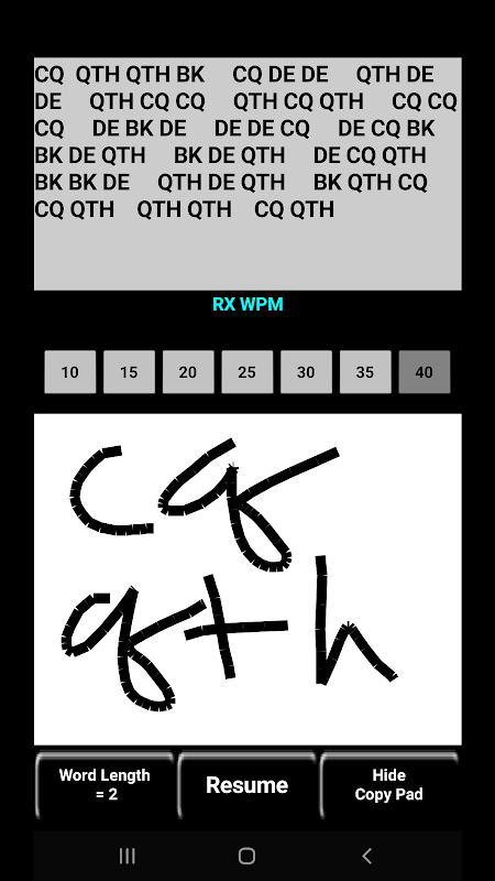 CW Mors kodu öğrenme Android uygulaması yalnızca 10, 15, 20, 25, 30, 35, 40 WPM'de RX'dir.