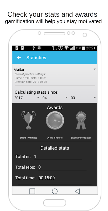 Tarih takvimindeki bireysel etkinliklere bakın ve günler geçtikçe ödüller kazanın. Pratik yapma beceriniz hakkında daha fazla bilgi edinmek için istatistikleri kullanın. O şarkıyı gitarda çalmak kaç saat sürdü? 100 şınav çekebilecek misiniz? Fransızca öğrenin ..? Oyunlaştırma, ödüller ve notlarınızla bir takvim, ustalık yolunda ilerlemenizi sağlayacaktır.