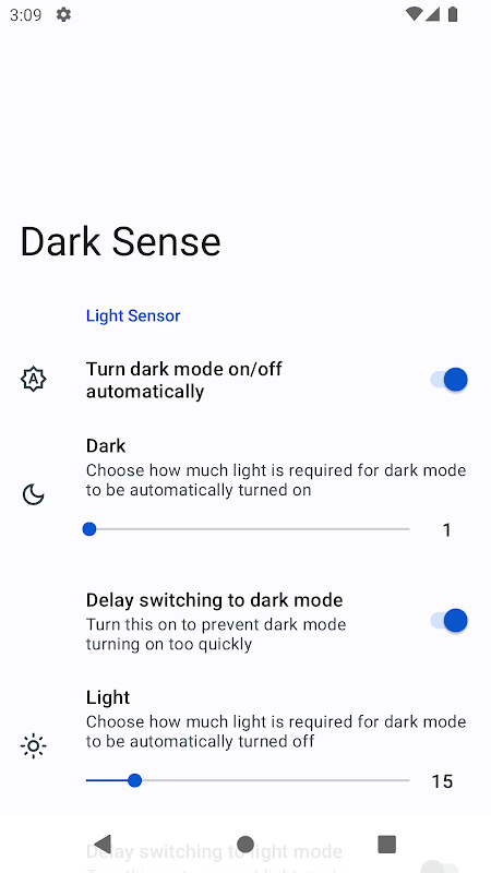 Dark Sense, arka planda çalışan ve cihazınızın ışık sensörü düşük ışık seviyeleri tespit ettiğinde otomatik olarak karanlık moda/temaya geçen ve cihazınızın ışık sensörü yüksek ışık seviyeleri tespit ettiğinde ışık moduna/temaya geçen bir uygulamadır.