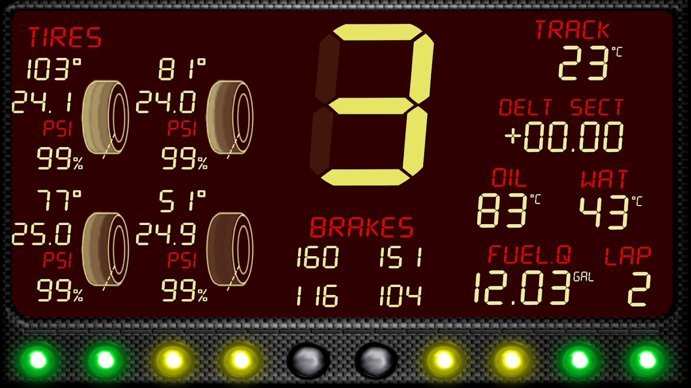 Lastik bilgileri (sıcaklık, dış / Orta / İç sıcaklık, basınç, aşınma), fren sıcaklığı, yarış bayrakları için LED çubuğu (damalı, yeşil, sarı, siyah bayraklar), hava durumu bilgileri (ortam sıcaklığı, yağmur şiddeti), pist sıcaklığı ve açık yol tutuşu, canlı delta süresi, kalan oturum / geçen süre / turlar, DRS / Flap durumu, gerçek zamanlı araçların pist konumları, önünüzdeki ve arkanızdaki sürücülerle gerçek zaman farkı (Yarış) ve öndeki sürücülerin en iyi tur süresi arkanızda (alıştırma, yeterlilik) ve özel yakıt hesaplamaları.