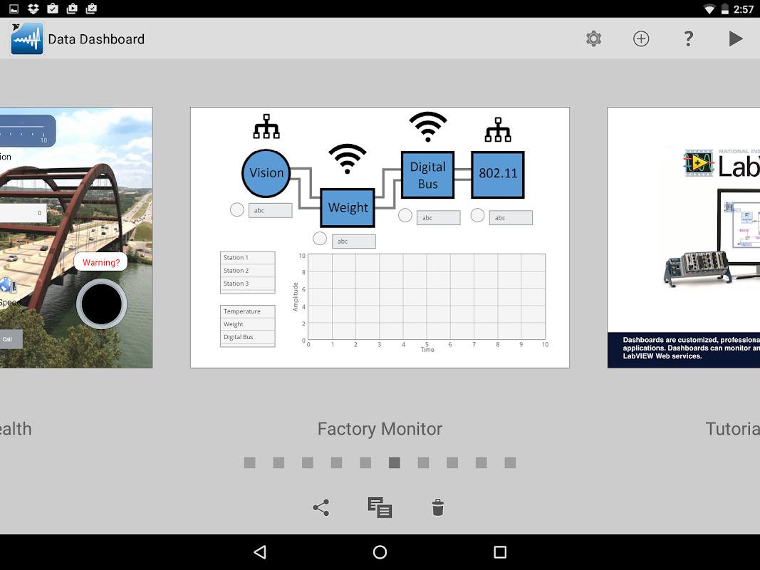 With Data Dashboard for LabVIEW, you can create a custom dashboard that you can use to remotely control and monitor running NI LabVIEW applications. You can connect deployed NI shared variables or LabVIEW Web Services with controls and indicators such as graphs, meters, and switches.