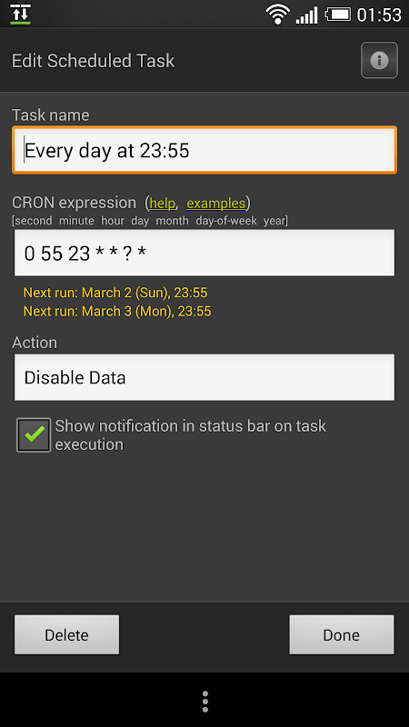 - Scheduled tasks that allow to turn on/off Mobile Data at certain times or dates