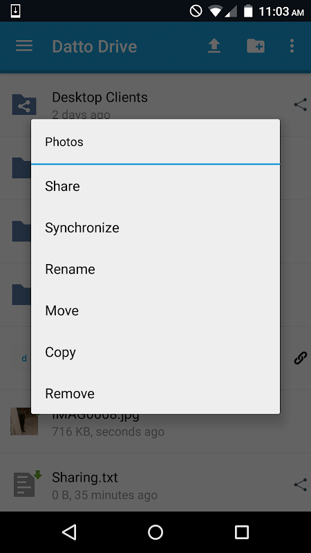 The Datto Drive Android app connects to your Datto Drive cloud share to browse files, create and edit new files, share, and keep the contents of those new contents in sync across Datto Drive.