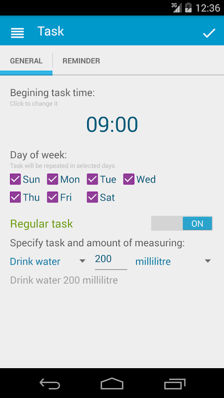 Creating a task you will find the following options in General Tab: time, days of week, regular (by default) or one-time, name, amount and units.