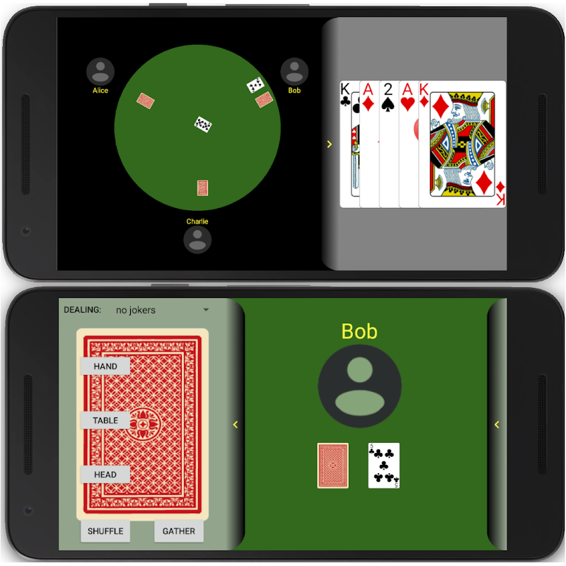One player, the dealer, deals cards to a maximum of 11 other players. Just like real cards, each player can see the cards in their own hand and the cards on the virtual table in front of other players. Each player's device shows their own cards and a common view of the table.